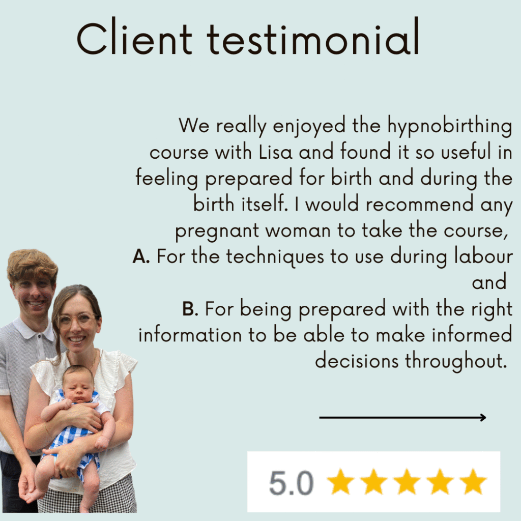 “I decided to take part in a hypnobirthing course when I was expecting my first baby. Understandably I was very nervous about the pending birth and felt that the more information I had when the time came would be really helpful. I decided to take part in the course offered by Lisa after she was recommended by a family friend.