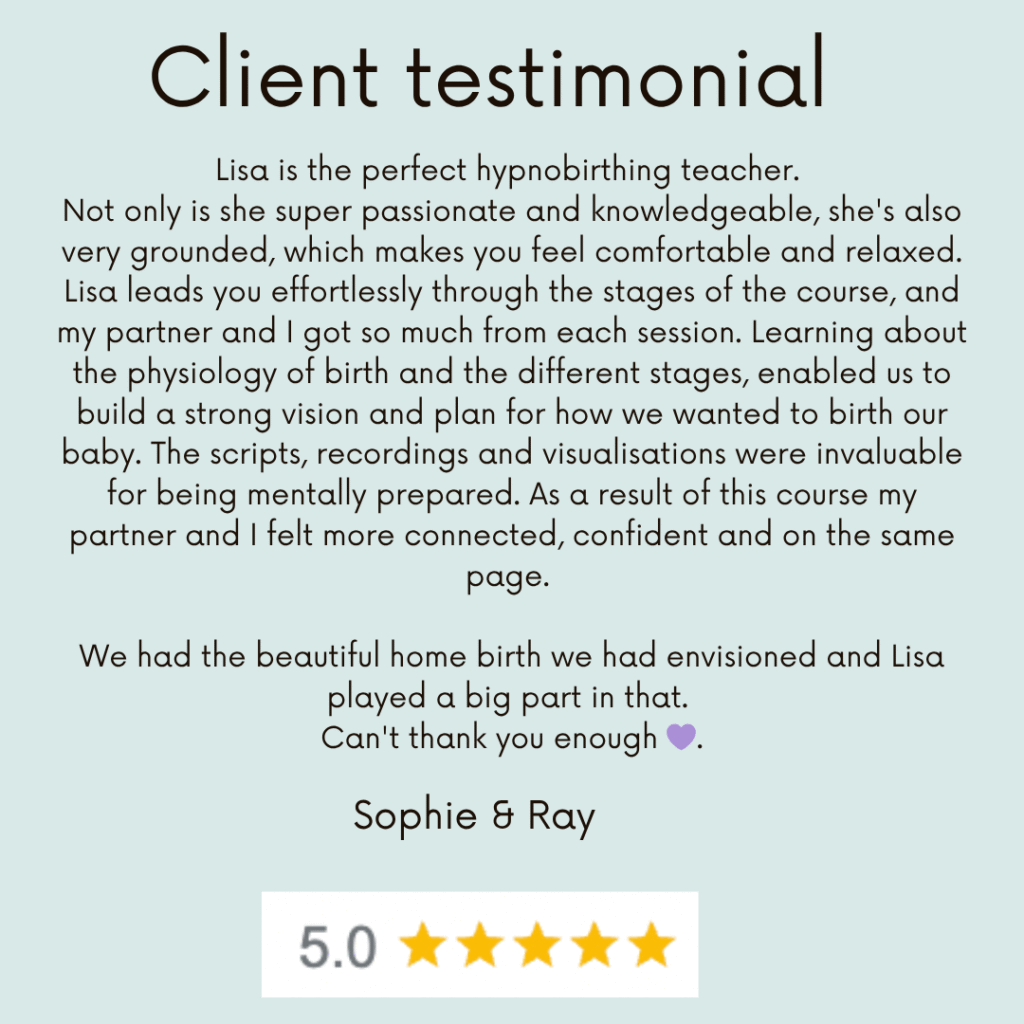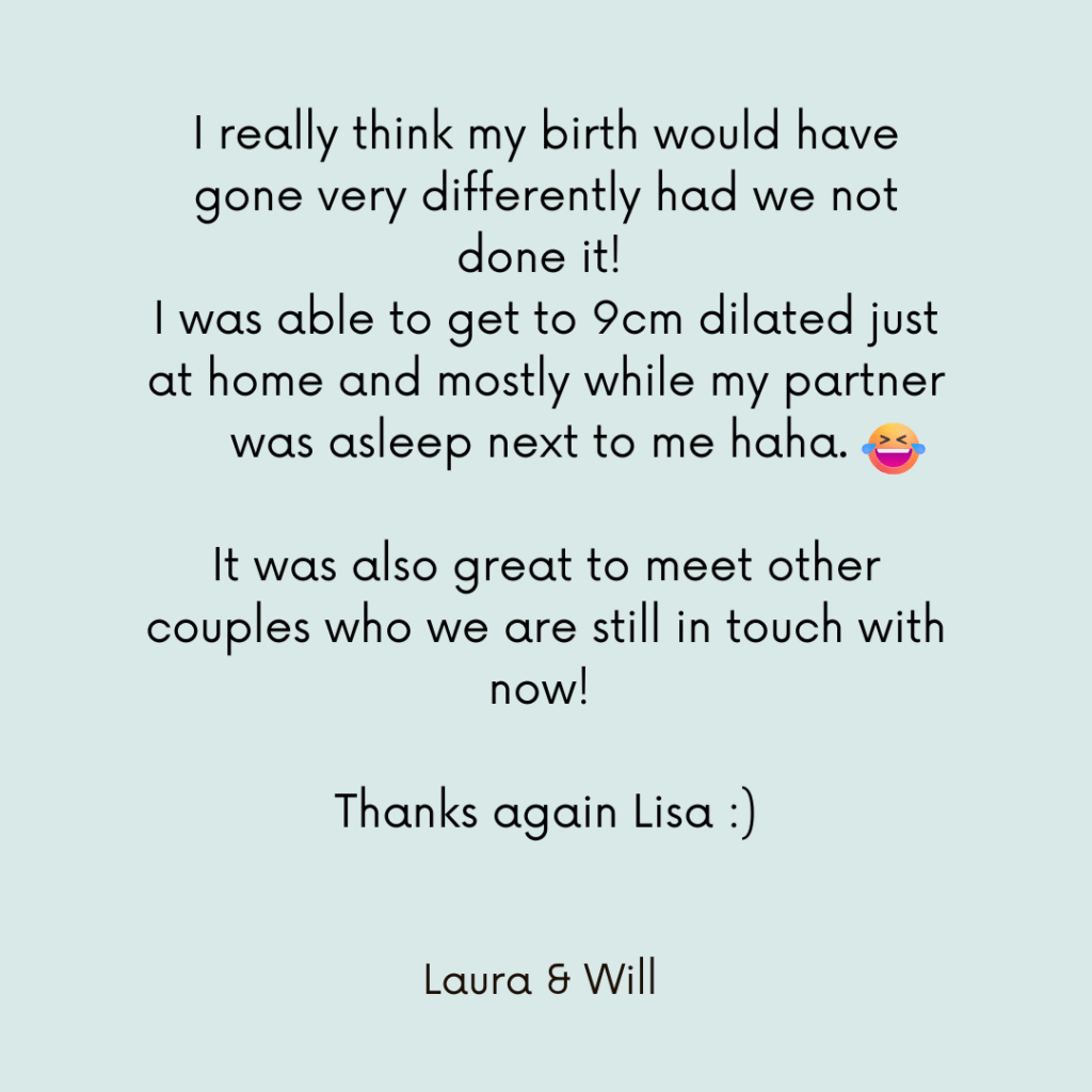 “As an anxious first time father I was worried that I’d be a spare part during the birth and was completely clueless about what would be needed or how I could help. I watched a few minutes of One Born Every Minute where a father was totally crap and ended up fainting. It’s been spinning in my head ever since. After a month with Lisa I’ve now got a much better understanding of the science and psychology of birth and how I can play an active and positive role in making it the best experience possible. Thank you @Mindfulbirths for empowering both of us. “