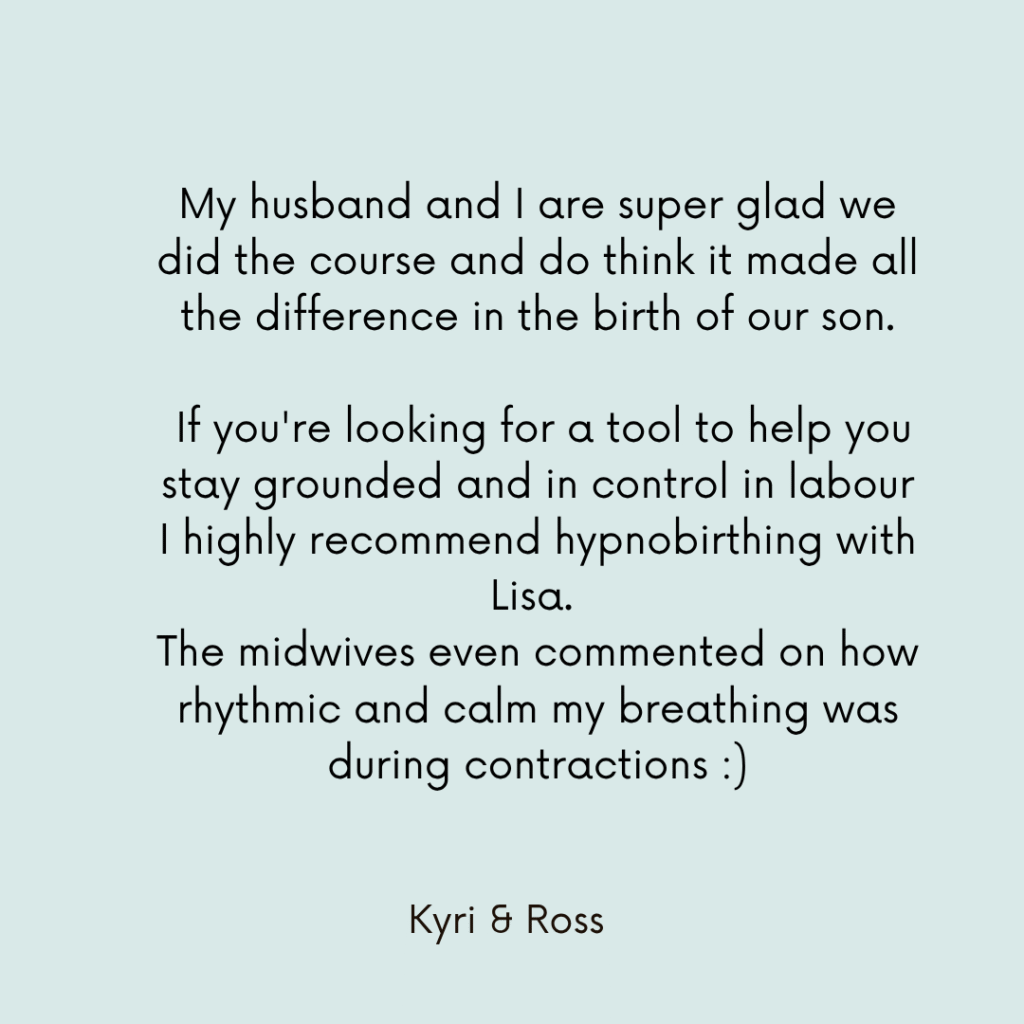 “Colin and I really enjoyed the Mindful Births KGHypnobirthing course with Lisa. It was thorough, informative and really very interesting. By the end of the course we felt prepared for the final trimester and labour/birth experience.